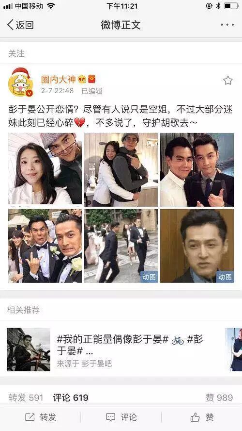 而近日疑似彭于晏恋情曝光的消息出来,好像是彭于晏女友发布了一条状态,写到:生命已完,下面配的图却是她从后面抱着彭于晏的照片。照片里,彭于晏很宠溺,而女的一脸幸福的闭着双眼,很享受。
