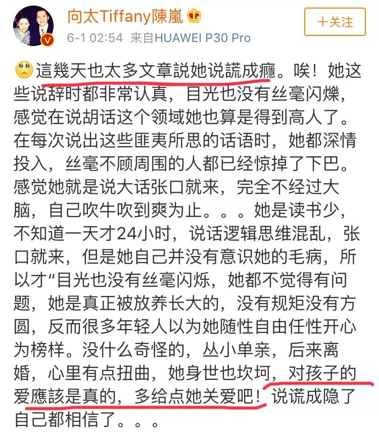 墙倒众人推,在张柏芝被网友批判成“谎话精”之后,向太陈岚也在微博上发长文自我分析了她“说谎成瘾”的原因。