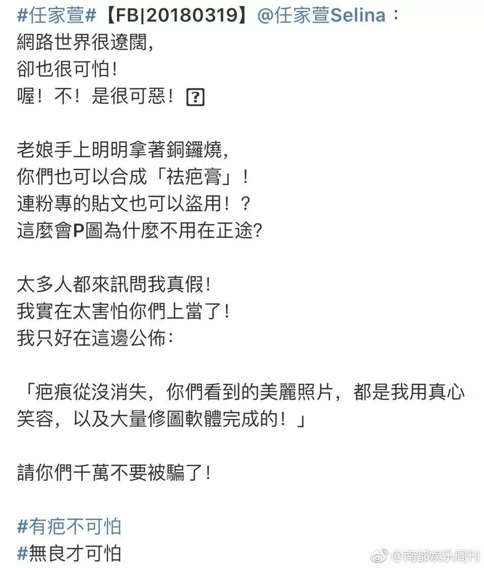 气得Selina直接PO出原图怒怼商家:““网络世界很辽阔,却也很可怕!喔!不!是很可恶!”“疤痕从没消失,你们看到的美丽照片,都是我用真心笑容,以及大量修图软件完成的!请你们千万不要被骗了!”