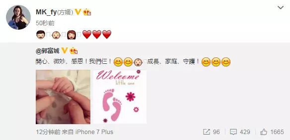 郭富城开心写到:“ 开心、微妙、感恩!我们仨!成长、家庭、守护!”方媛也有转发~