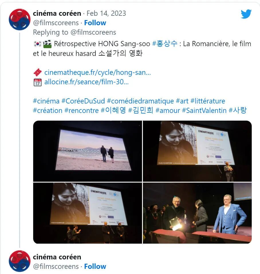 回顾展的开幕作品是《小说家的电影》,洪尚秀导演用英文发言:「 除了问候之外,我也不知道我该说些什么,这些年我也拍了不少电影,电影里都饱含当时那段时间的想法,现在回过头来看,我却发现我也不知道自己那时候拍摄了什么,一直到现在为止我都是这种拍摄方式,拍了一部又一部,我不是一个只看过去的人,所以我不会看著旧作再去理解为什么要这么拍 。不管怎么说今后我还会继续拍电影。」 金敏喜接过话筒继续说道:「今天刚刚抵达巴黎,时差还没倒过来,有点累,但看到你们心情就变得很好,谢谢大家的到来,希望今天的电影能够长久留在大家的记忆里,祝大家有一个温暖的夜晚。」