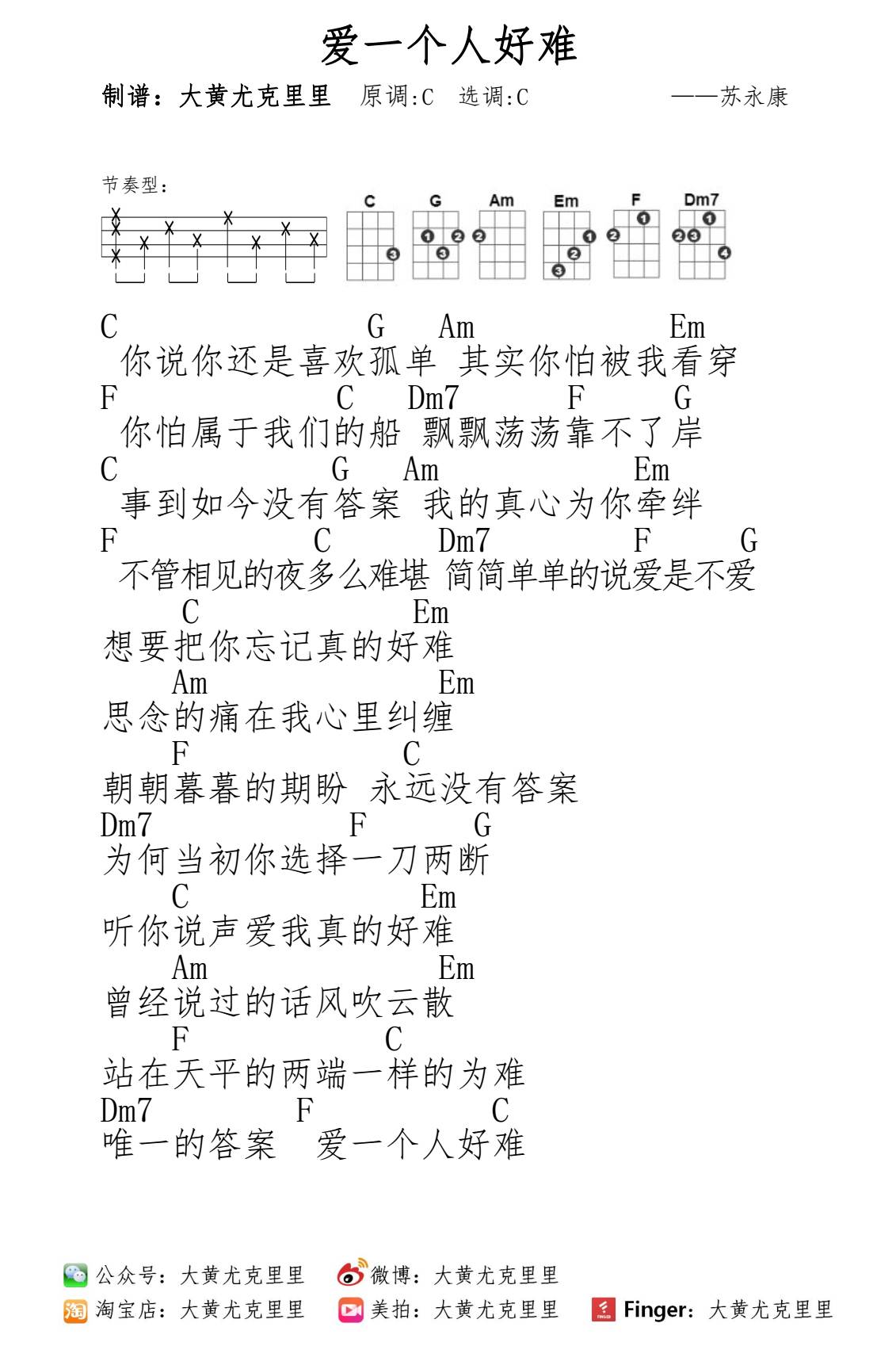 爱一个人好难 ——苏永康【每天一张尤克里里谱:第九百八十五首】 大黄尤克里里 港台男星 2017-11-28 18:18:42 797 创作不易,用心坚持,欢迎请BaGua喝几杯爱心咖啡!打赏并支持本文 打赏并删除本文 每天一谱戳进去可以查看自学课程哦:第一课:调音第二课:音阶第三课:四大和弦第四课:分解节奏型第五课:右手食指扫弦第六课:切音 《情非得已》第七课:民谣摇滚节奏型 《小手拉大手》第八课:切音的运用 《青春修炼手册》第九课:卡农和弦 《遥远的她》《天使》《倔强》《知足》第十课:复合节奏型 《思念是一种病》尤克里里弹唱 & 教学视频:《闷骚的你》——好妹妹乐队《生活不止眼前的苟且》——许巍《历历万乡》——陈粒《祝你生日快乐》《追梦赤子心》——GALA《残酷月光》——林宥嘉《后来的我们》——五月天《可惜没如果》——林俊杰《七里香》——周杰伦《分手快乐》——梁静茹《旅行的意义》——陈绮贞《当你老了》——赵照《宠物小精灵》——国语版《蓝瘦 香菇》《女孩子》——大黄尤克里里完整和弦表淘宝店铺搜索:大黄尤克里里 创作不易,用心坚持,欢迎请BaGua喝几杯爱心咖啡!打赏并支持本文 打赏并删除本文 感谢您的支持鼓励,我会继续努力的!文章地址:用户邮箱:打赏金额:USDT 请输入数字点击”去打赏“,即可进行打赏支持本文章哦 苏永康 About the Author 大黄尤克里里 功能介绍:六扇门里太龌龊,不如四根弦上取磊落. Related Posts 换——金玟岐【每天一张尤克里里谱:第一千四百零九首】 2019-03-14 22:52:19 小白——周柏豪【每天一张尤克里里谱:第一千三百七十八首】 2019-02-11 23:15:45 跳舞吧——陈绮贞【每天一张尤克里里谱:第一千三百六十八首】 2019-02-01 20:38:48 短发——梁咏琪【每天一张尤克里里谱:第一千三百六十一首】 2019-01-25 23:11:31 别说没爱过——韦礼安【每天一张尤克里里谱:第一千三百零六首】 2018-12-01 18:47:39 发表评论