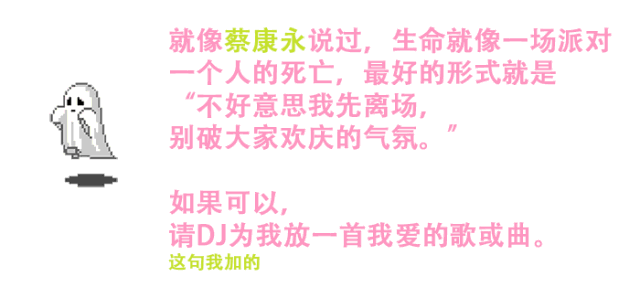 害怕死亡,死了之后啥都做不了了,但必须慢慢学会坦然以对。葬礼上给我来首嗨曲吧,可以蹦起来,什么都行,别太俗的。