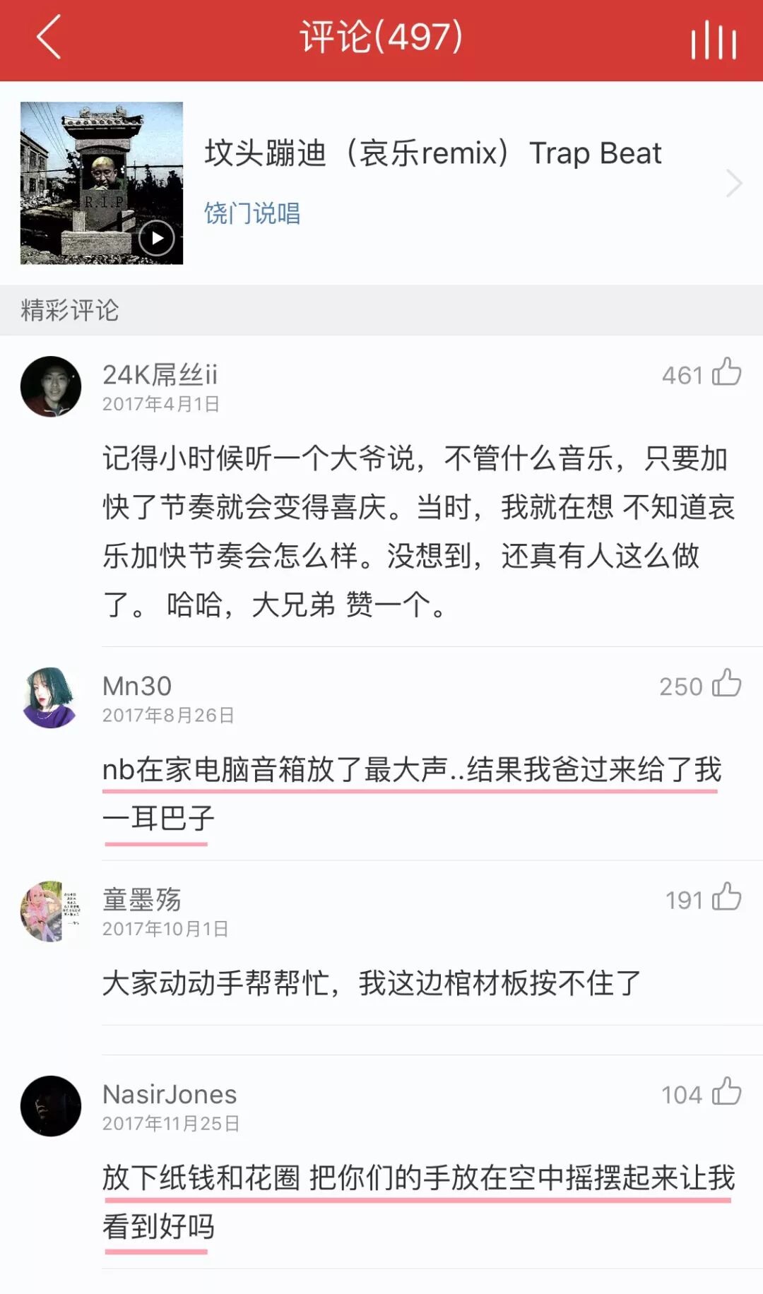 这首先锋得我都接受不了(慎重点听),Trap和Rap里藏着真朋克,还有一首网易云音乐上嘻脉男孩的《坟头蹦迪》,这里找不到链接,歌词是:居民同志们,欢迎大家来参加,我的追悼会,白菊花扔掉,红包放我旁边噢,谢谢,想要做一首说唱,是关于快乐地讲死亡,为什么哭哭啼啼,哀乐放,护士姐姐把头低下,put your head down,听我指挥把手举高put your hands up,也是小心试听为好。