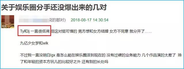 与此同时,某著名爆料论坛开始立贴了,说娱乐圈中已分手但还没有曝出的明星,其中“ty和lj(唐嫣罗晋缩写) 一直很低调, 但这对挺可惜的,男方想和女方结婚,女方不同意,就分开了……”这种爆料的可信度目前基本为零,但是鉴于该爆料论坛一般所爆之料最后大都被验证为真(比如阚清子与纪凌尘分手就是最早这里爆出来的),所以还是采取“马克”一下的操作比较好。