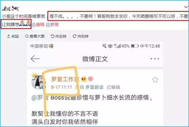 果然,粉丝们(主要是CP粉)按捺不住了,有人未免疑神疑鬼了起来,特意发博问:“晋哥我求求你,今天晒票根可不可以呀,不要让我瞎想……”而很多粉丝也都炸了庙,在评论中表达了自己的担忧……