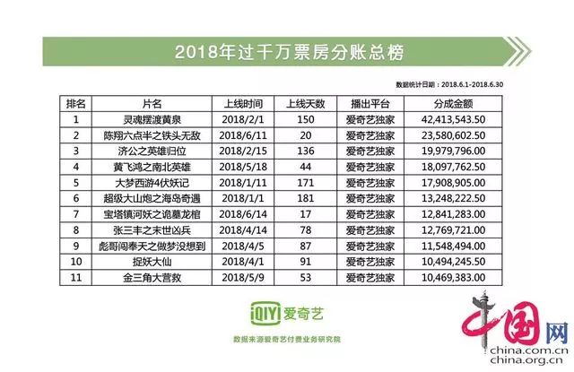 我国当下最大视频网站爱奇艺数据显示:截止6月30日,2018年上半年爱奇艺网络电影TOP10总票房分账超1.8亿,相当于院线电影5.4亿票房成绩。除了商业上的突破,2018年上半年,网络电影市场在指导部门和平台的规范化策略下,呈现出精品持续涌现,多种类型开花,青年人才涌现的发展态势。6月分账票房榜数据显示,2018年6月份爱奇艺新上线网络电影中,《陈翔6点半之铁头无敌》上线20天片方票房分账收益达到2358万,《宝塔镇河妖之诡墓龙棺》上线17天,票房分账收益1284万,《暴走狂花》上线30天,票房分账收益962万,达到准千万水平。新片TOP10总分账票房共计7187万,同比17年6月TOP10总分账票房1995万,增长260%。