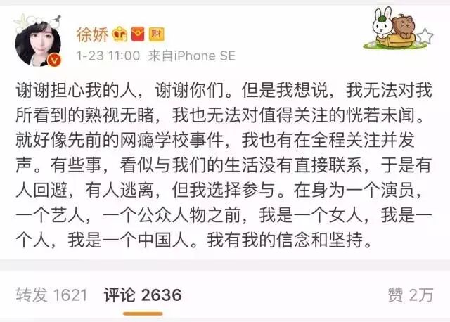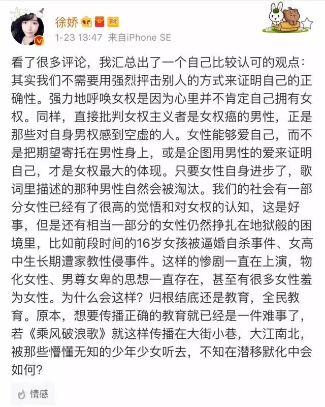 说真的,看到徐娇连发三条微博表明自己的态度,表达自己对于女权主义的支持,其实挺令人感动的。她已经不再是长江七号中的那个小男孩,她有自己的思想和见识,同时拥有表达自由,除了明星之间电影之间一味地吹捧和赞美,有时候我们需要听到最真实的声音。