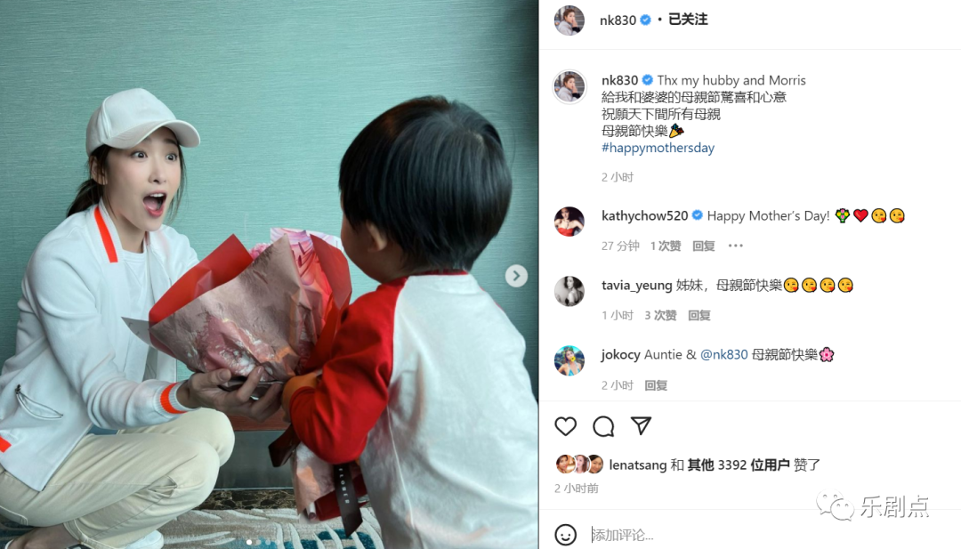 她配文称,感谢我的老公和儿子Morris,给我和婆婆(粤语有外婆的意思)的母亲节送上惊喜和心意,祝愿天下间所有母亲,母亲节快乐。发文后,亲姐周汶锜以及闺蜜杨怡纷纷留言点赞。