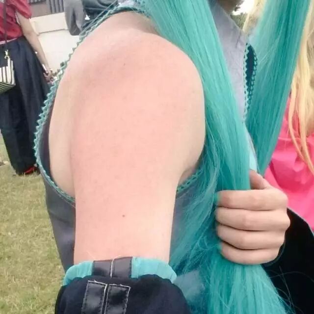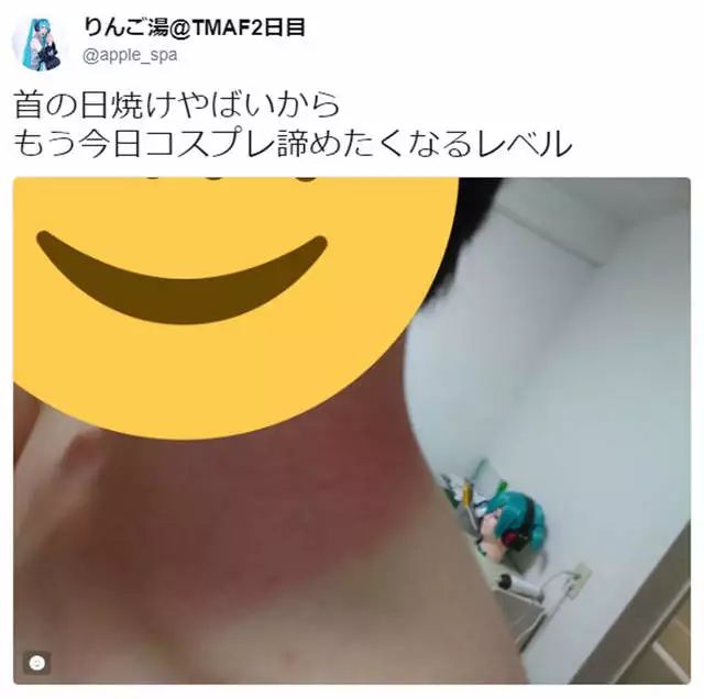 一位日本网友「りんご汤」最近cos成初音未来参加COSPLAY活动就因为没注意防晒而被晒出有趣的痕迹引发话题,然而她其实去年就被严重晒伤过了,怎么还没有记取教训呢?