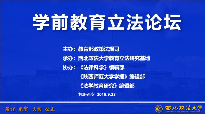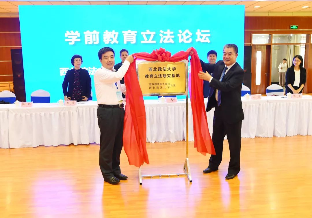 2018年9月28日,由教育部政策法规司主办,西北政法大学教育立法研究基地承办的学前教育立法论坛在西北政法大学图书馆一层报告厅隆重举行。来自教育部政策法规司、教育部基础教育司、全国人大教科文卫委员会教育室、陕西省教育厅以及北京大学、中国人民大学、北京师范大学、北京外国语大学、华中科技大学、复旦大学、中南大学、西南大学、东南大学、中国教育科学研究院、陕西师范大学、湖南师范大学、华东理工大学、东北师范大学、辽宁师范大学、浙江师范大学、陕西学前师范学院、陕西省各市县教育局、幼儿园等单位的70余名领导、专家学者及学前教育一线工作者出席了会议。开幕式上,王大泉副司长、宋觉书记共同为西北政法大学教育立法研究基地揭牌,杨宗科校长主持了“学前教育法—百所幼儿园立法调研”获奖报告颁奖仪式。