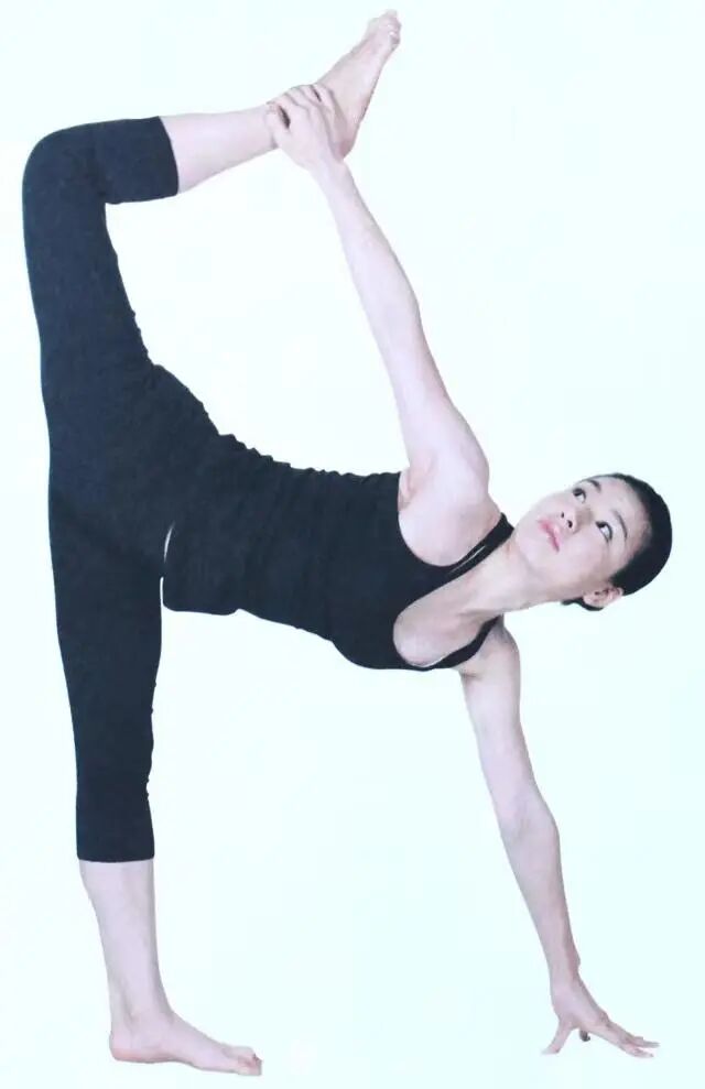 体式要点:双膝伸直,站立在地面上,上半身向前弯曲,将双臂向地面方向伸展,身体稳定不动之后,将一侧腿向后、向上伸直,同侧的手握住脚尖也同样向上伸展,保持尽量长的时间。