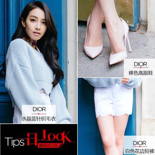 造型解析:蓝色毛衣、白色短裤、裸色高跟鞋均来自 Christian Dior