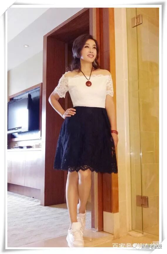 整体只有黑白色的刘晓庆看起来成熟稳重,黑色的蕾丝裙又为她增加了几分女人味,露肩的上衣露出了她优美的肩部线条。