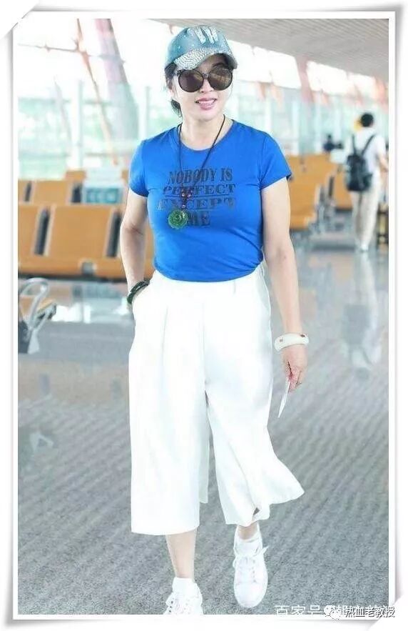 刘晓庆穿了一件蓝色的短袖搭配白色的阔腿裤,非常简单的搭配,也很适合夏天,看起来十分的清爽干净。