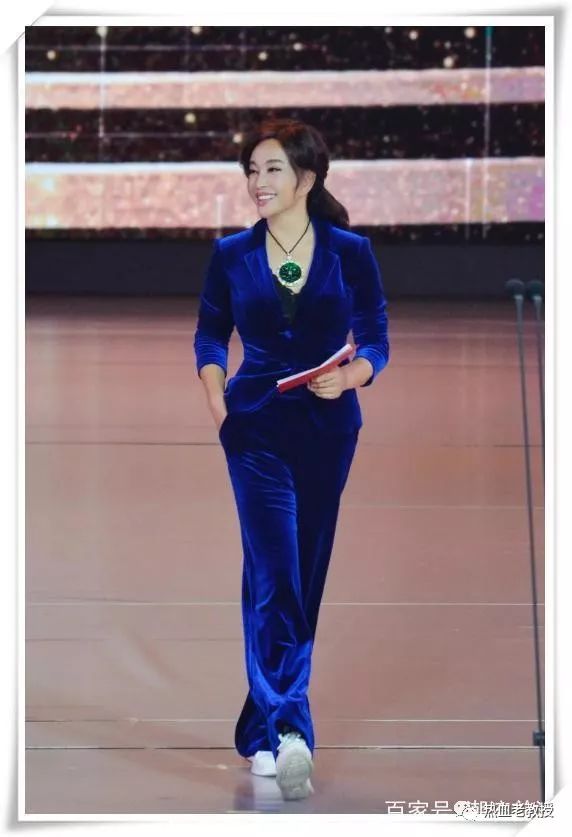 丝绒材质的衣服都很显身材,对刘晓庆也是一种考验,丝绒的西装很容易显胖,但是刘晓庆穿上却没有丝毫赘肉。