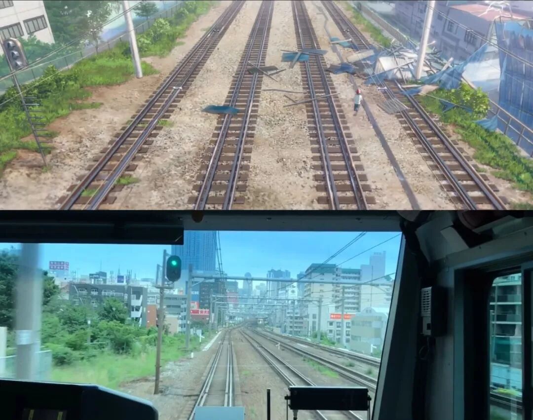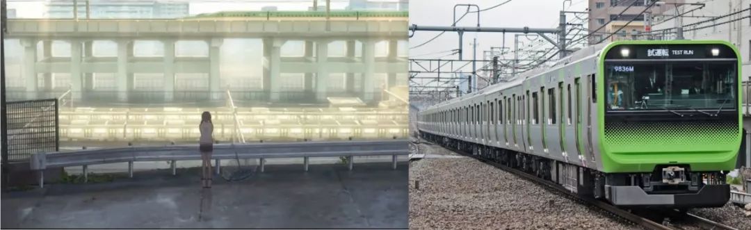 JR东日本企划作为制作委员会之一的参与让新海诚更加肆无忌惮,以至于微博上有人吐槽本片是“JR东日本长篇音乐MV”,诚哥不仅把至关重要的天气神社和女主家都安排在了铁路边,还强行加入了一段“山手线狂奔” 的桥段,片中出现的各种电车除了E231系、E233系及新干线E5系之外,山手线的列车也按照2021年的时间线换成了最新的E235系,某个孩子在窗台上发现鱼形生物时地上摆着的也是多美出品的E235玩具…不得不说“电车狂魔”实至名归。此外,山手线E235的上一代E231系500番台电车将逐步于2020年春天前全部转至中央总武缓行线,这个冬天可能是见到绿色的E231的最后时机,各位铁otaku不要错过哦~