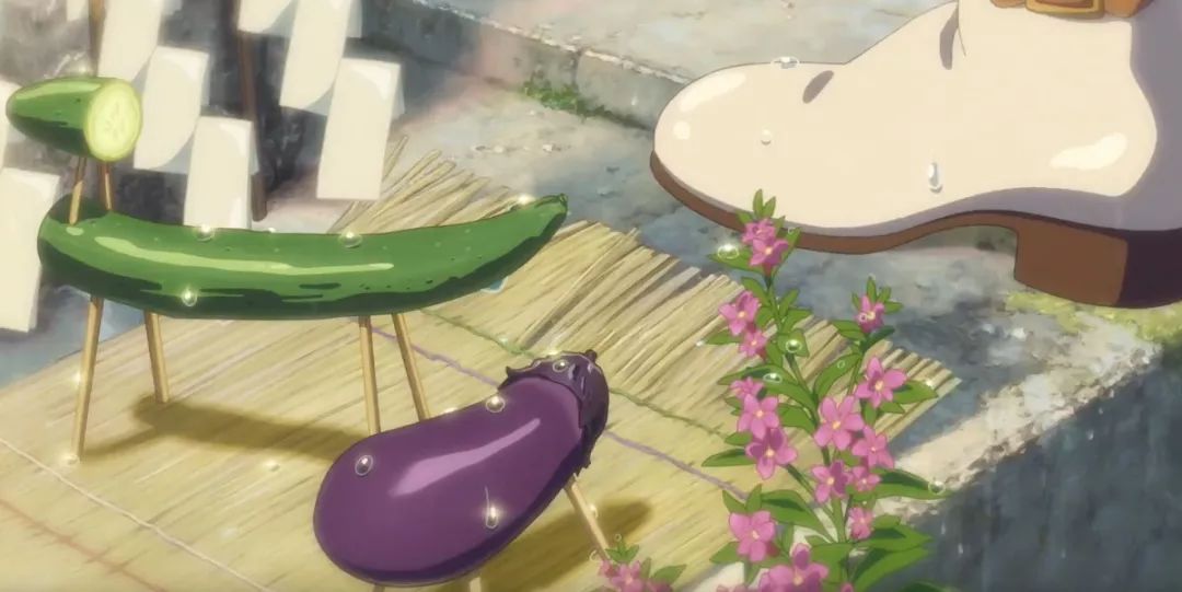 代代木会馆顶楼的鸟居前和立花家的供桌上都出现了带有木腿的茄子和黄瓜,这种习俗名为“精灵马”,常见于盂兰盆节期间,象征着承载故人灵魂往返于现世与彼岸间的坐骑,黄瓜制成的是奔驰的马,寓意早早归来,茄子制成的是迟钝的牛,寓意缓缓离去。这里存在一个Bug:从阳菜第一次成为晴女到片中剧情发生的一年间,这两只“精灵马”都始终鲜亮地立在鸟居前,至于是超自然之力还是有人故意为之,大概只有诚哥清楚了。