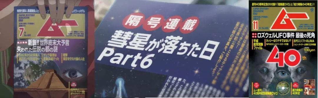 4. 须贺圭介投稿的《ムー》是一本确实存在的志怪杂志(颇有一种当年《飞碟探索》的感觉?),《你的名字》中敕使河原爱看的也是这本杂志。片中杂志里也提到了八年前的那次陨石坠落事件。