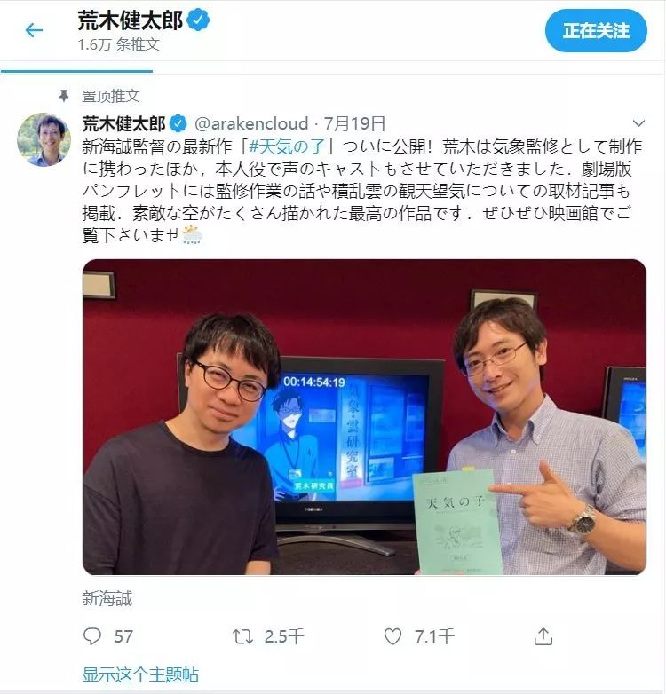 10. 片中夏美和帆高进行“晴女”调查时那个神神叨叨的气象研究员荒木确有其人,是“日本气象厅气象研究所预报研究部第三研究室研究官”(从头衔就能看出研究得很深入…),荒木健太郎本人是气象与防灾减灾科普的名人,除了亲自配音外,也参与了电影中各种天气现象的监修。