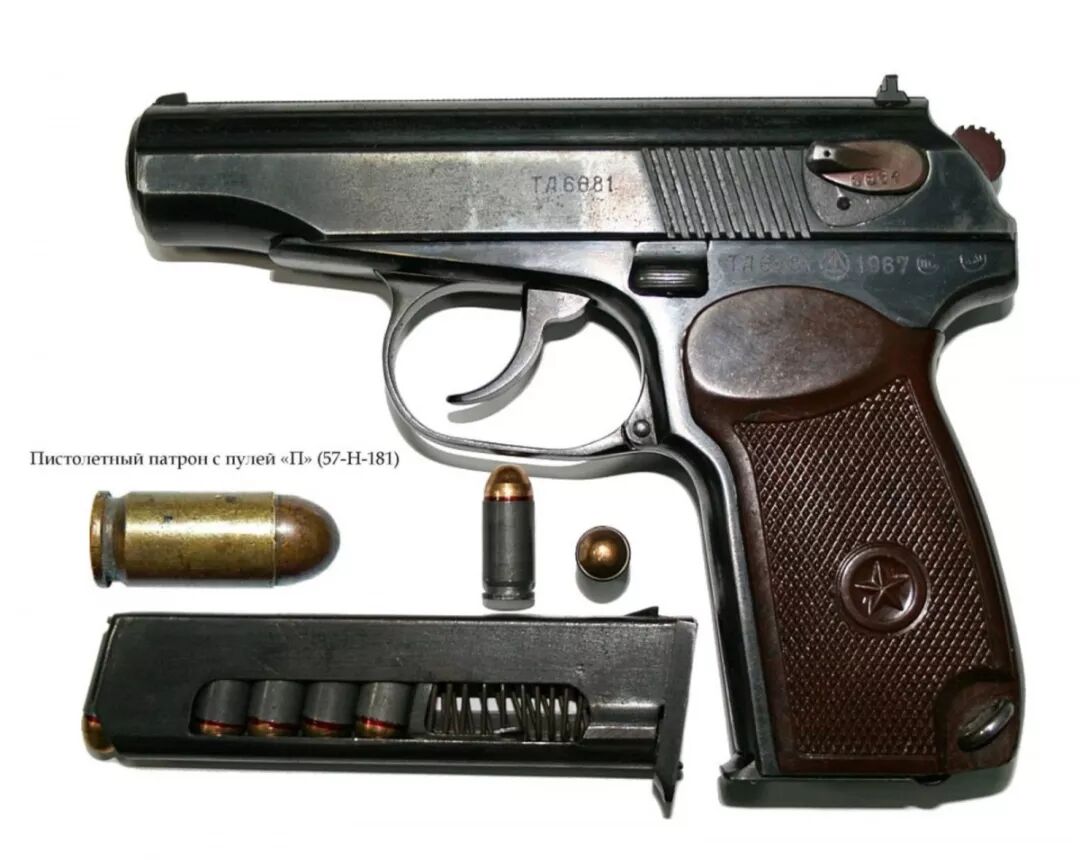 5. 男主捡到的手枪是苏联生产的马卡洛夫手枪,使用的子弹为型号57-Н-181的铅芯黄铜套壳9×18mm子弹。