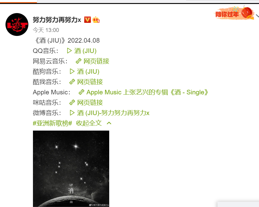 除了发文,今天还发了新歌《酒》,开头有其他EXO成员的语音,歌词写到: