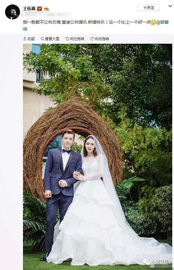 今日,王栎鑫在网上发了一篇配文图,称公布婚讯,这个比上一个好,而看到照片中的新娘,网友都称这不是吴雅婷,明明是郭碧婷,难道王栎鑫离婚了?这是什么情况,网友们一度有些蒙圈了。