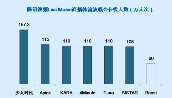 此前腾讯视频Live Music直播的代表K-POP前沿的韩团少女时代、T-ara、SISTAR、Beast、4minute和Apink,女团组合的直播观众均在百万以上,其中最高的是少女时代,为157.3万。