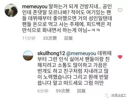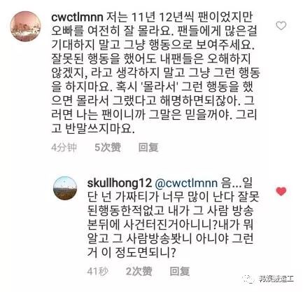 粉丝说:“有什么难处说出来,不是通过回应这些消息的吧,粉丝们全是这样的?都是李弘基自己的想法所以不是这样的,因为不喜欢这个反应。通过回应这个消息,我也要彻底脱饭了 谢谢”。李洪基回复:“不是回应 是很气才写的这些 慢走(平语)”。