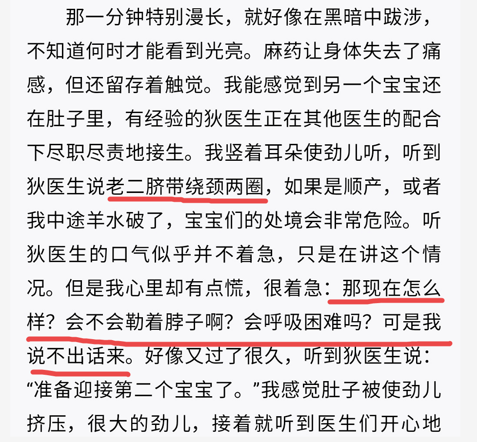 等到真正生产时,老大已经出来了,老二却脐带绕颈2圈,这让谢娜顿时发慌,担心宝宝的安全:怎么样?会不会勒着脖子?会呼吸困难吗?