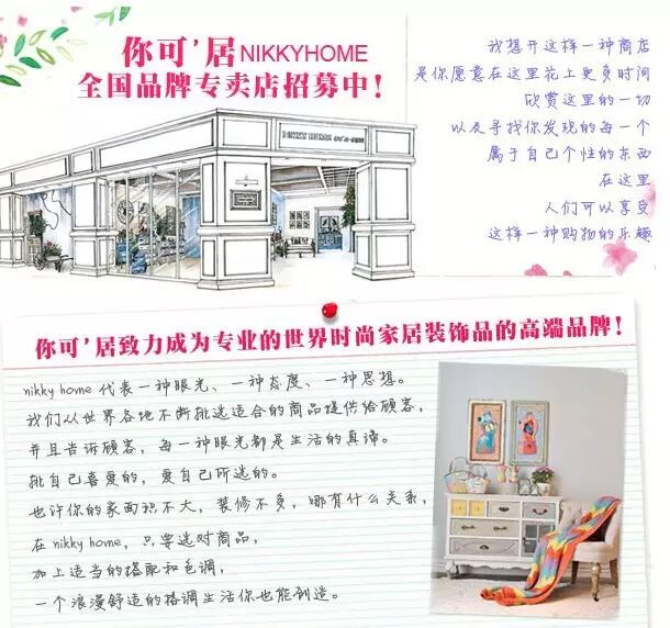 NIKKY HOME你可居创建于2009年,其精致的产品和唯美的风情引起消费者强烈的反响。成为“世界时尚家居领导品牌”是你可居一直以来的梦想和努力的方向。