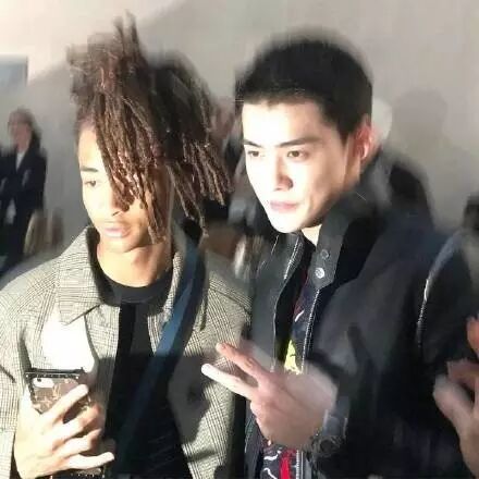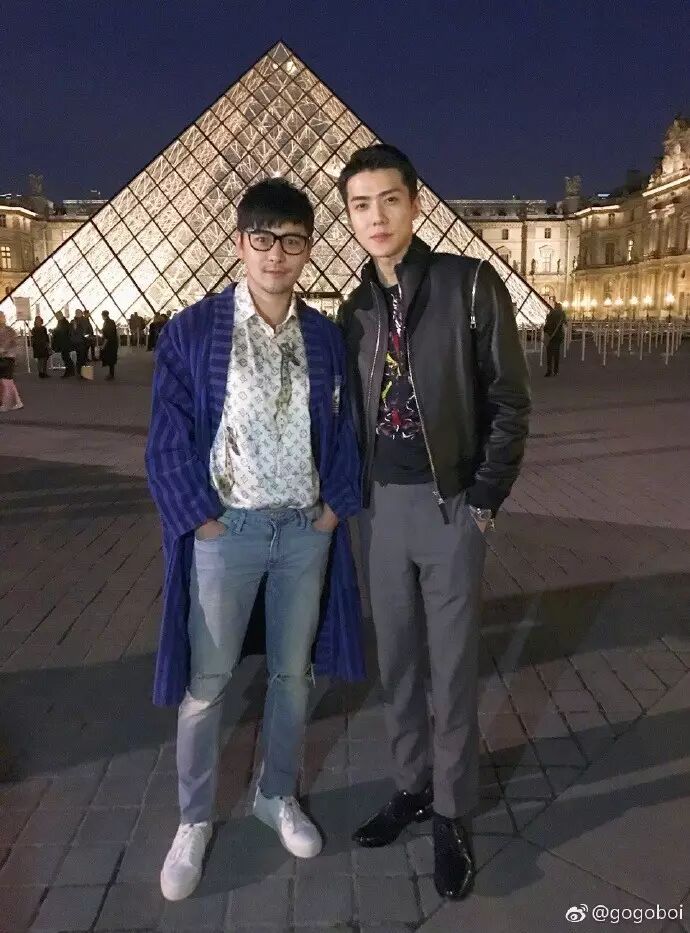 然后再继续等,看见传说中158的宇博gogoboi进来了,其实当时没怎么看清正脸,戴个眼镜,挺白挺瘦的,穿着lv动物款白衬衫,蓝色条纹系带大衣配小白鞋,想想应该是他了。一进去就扎进人堆里跟中国的外国的时尚圈人士各种招呼。后来他看完秀发了张和我勋的合照