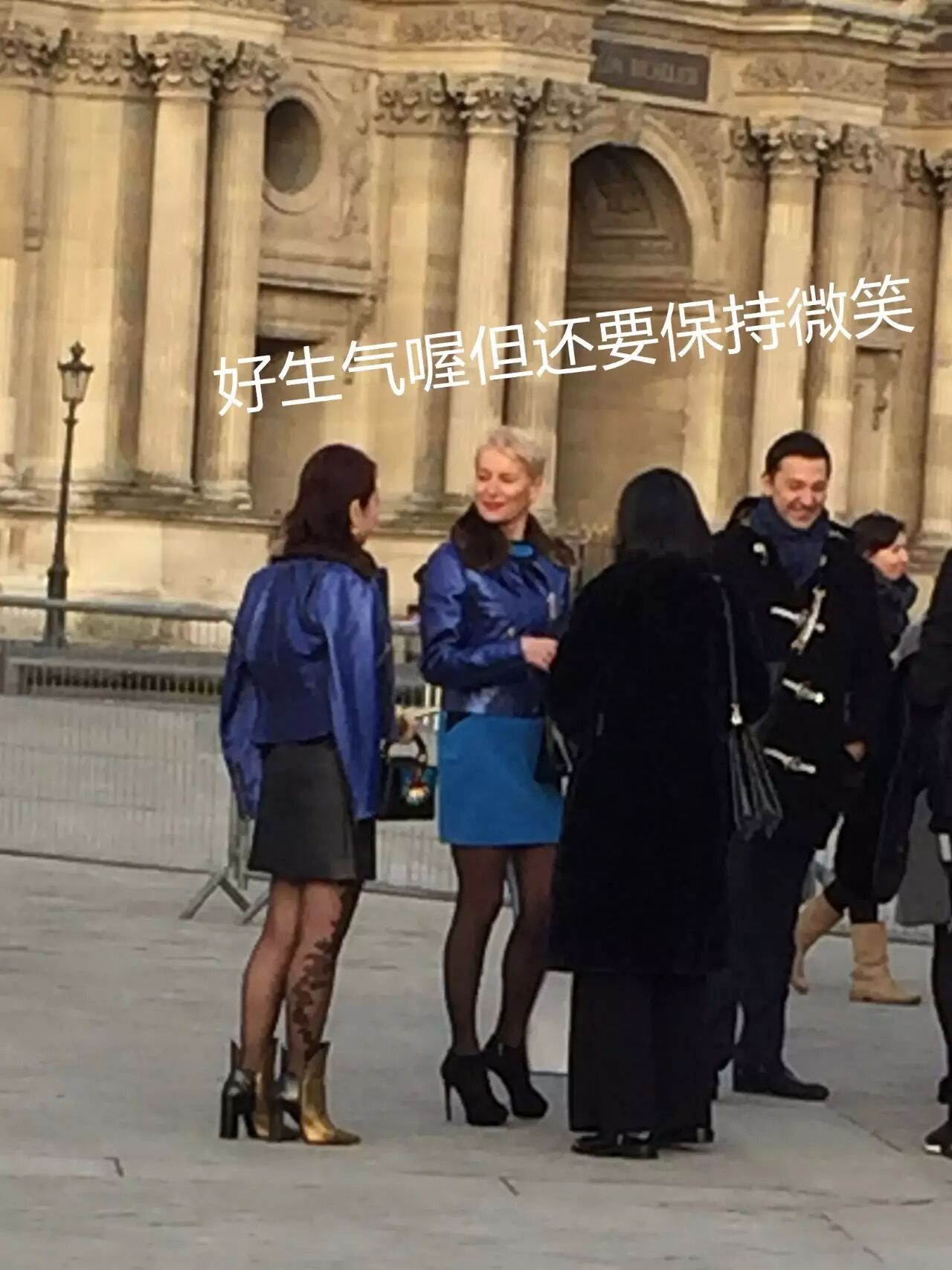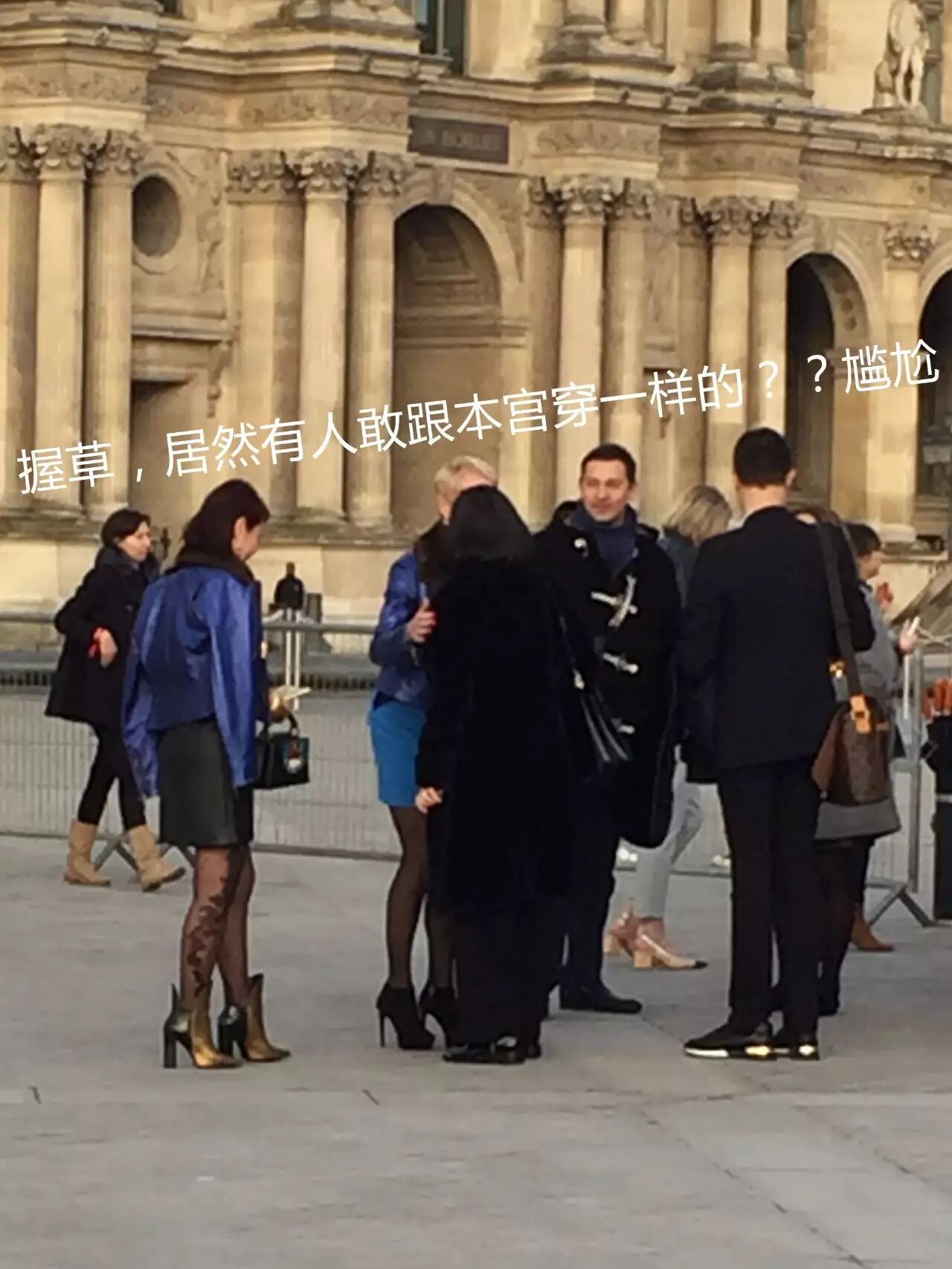 因为想让世勋看到我,我穿了一件银色的春款薄外套,在巴黎的寒风中冷得脂肪颤抖。大概六点左右开始,看秀嘉宾们陆续来了,都是从中间的这个通道进(后来才发现原来明星都是从左侧门进),然后就是满满的时尚圈套路了:在大门口堆着互相寒个暄,贴个脸,自个拍(然后发现原来他们也是用手机自拍…也并没有比我们高级一点)。然后还幸运地目睹了两位女嘉宾撞衫现场,于是看出了整部秀场内心宫斗戏(其实后来陆续来了三个穿同一件蓝色皮衣的姑娘,所以撞衫的是5个人)
