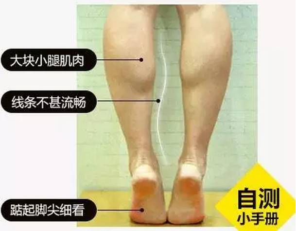 求美者可以自我检测,准备一个长身镜,踮起脚尖,脚跟离地,检查小腿腿部线条,若肌肉线条不流畅,某块肌肉用力产生大肌,及属于肌肉型小腿。