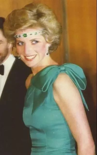 ▲戴安娜的创造力可不仅仅只在这一件珠宝上发挥了作用。伊丽莎白二世女王送给戴安娜的一条祖母绿项链,(现在看来更像是chocker)戴安娜除了常规佩戴外,也曾将它作为头饰带来佩戴,点缀着优雅的绿色连衣裙。