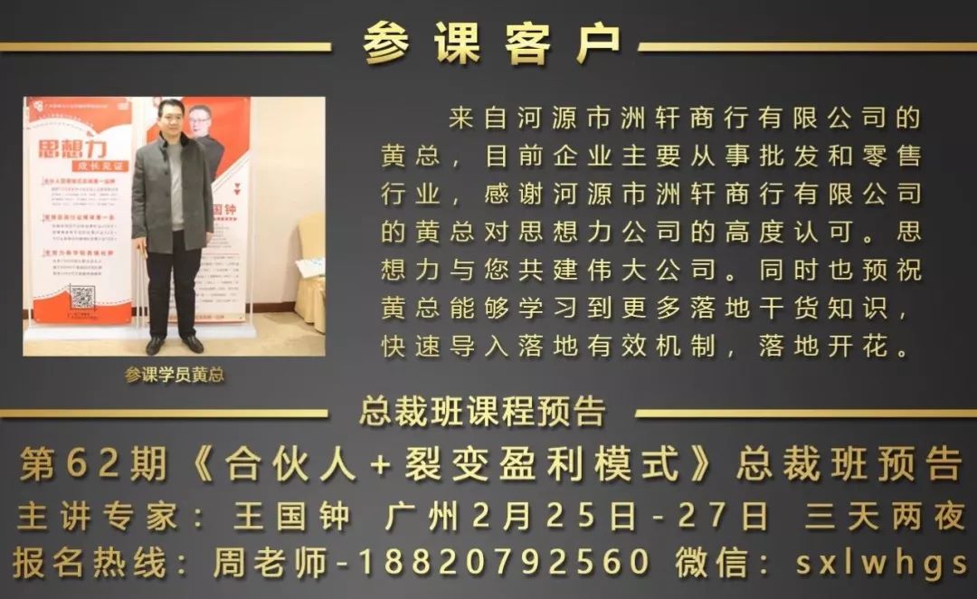 【案例10】白银玉洁口腔行业连锁店吴总2018年先后3次来广州学习王国钟老师的课程,公司落地并导入合伙人机制,业绩比同期增长80%,并且收入达到公司创办20年以来业绩最高点。