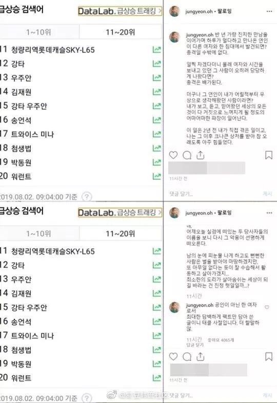 但8月2日,第四个人发表了不同的言论,吴静妍(徐章勋前妻)在ins上上传了安七炫和于周安在门户网站实时搜索词中的画面截图,并表示:“恋人和别的女人在一张床上被发现?这无疑是个打击。”