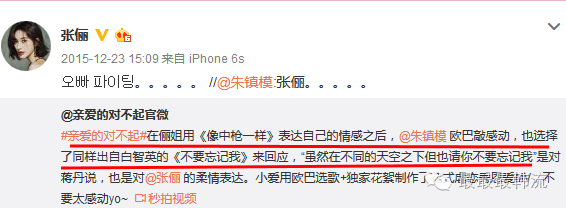 《亲爱的对不起》杀青的时候,张俪还在微博上po出了自己和朱镇模的合照↓