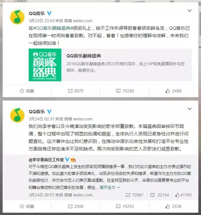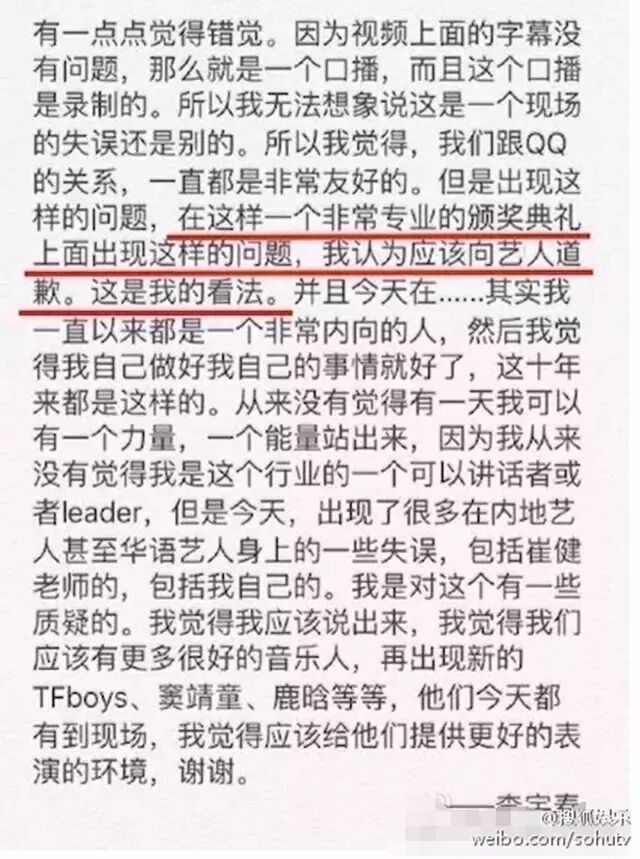 这是她出道十一年第一次要求道歉,也是当晚车祸连连的颁奖典礼上唯一一个要求道歉的艺人。在回答中,她并没有从女性的角度而是从一个歌手,内地乐坛的中坚力量要求得到尊重。当然,主办方也很快做出了的回复,BIGBANG,TFBOYS,鹿晗等明星都有“被出现车祸”的状况,然而QQ音乐在道歉中以“李宇春以及受到影响的歌手”而草草了事。很显然,她在捍卫自己的权利,很多时候,只有争取权利的人,才会被关注。