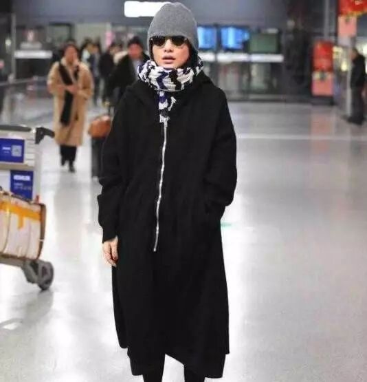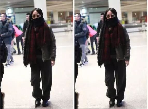 周迅身穿黑色的棉袄,一样还是全副武装,几乎只露眼睛出来,但是很多细节方面还是很吸引眼球,看上去星范十足。