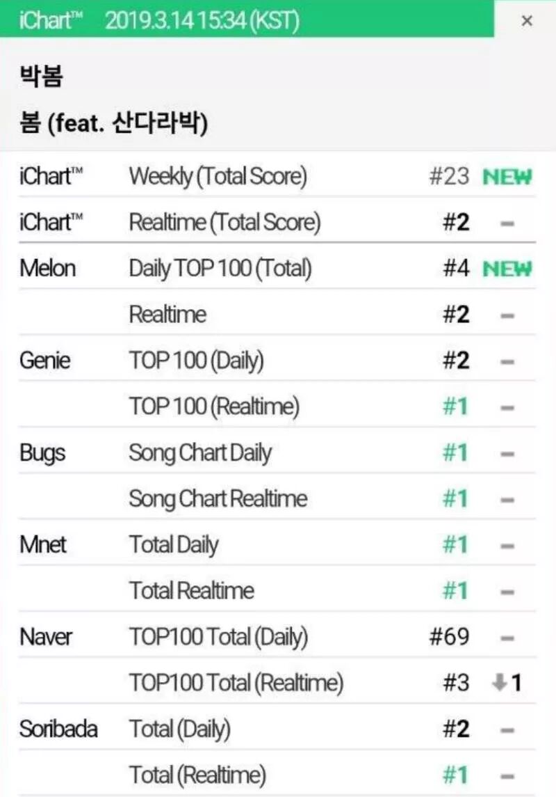 2NE1出身的朴春,昨日发行了单曲专辑《Spring》,同名主打歌在Genie、Bugs、Mnet、SoriBada、Olleh五个主要音源榜单获得一位;最大的音源网站Melon也排在二位。而朴春也透过所属社表达谢意:「谢谢等我这么久的粉丝们,想再一次对你们说谢谢,虽然有点担心,但是感谢这么多人听我的歌。」