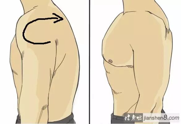 很多人可能会发现自己含胸,如下图图左。此时你要做的是将两肩如如图左箭头方向,转向后面,最终转型为图右,此时你应该能轻松地保持肩膀靠后,肩胛骨在后背夹紧。