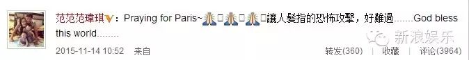 13分钟之后,估计是范范也看到了网友的评论,立马更新微博“Praying for Paris”