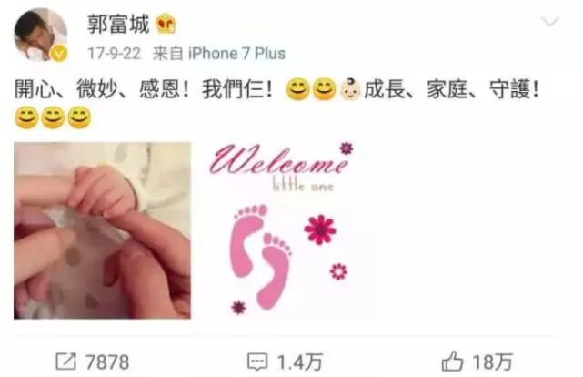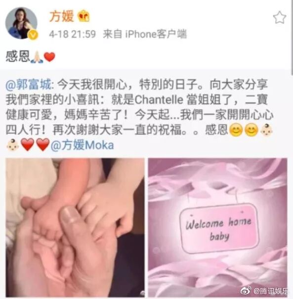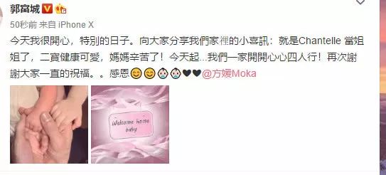 随后,城城经纪人小美回应:“谢谢大家一直关心城城,今天想跟大家分享一件开心事,就是家庭有了新成员,是一位小公主,白白胖胖很可爱,名字还没有,暂时叫他做郭二宝先。”