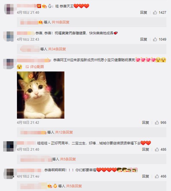 不少网友在下面纷纷送祝福,“一家四口幸福美满!!!”、“恭喜城城再得一宝!替你开心。”