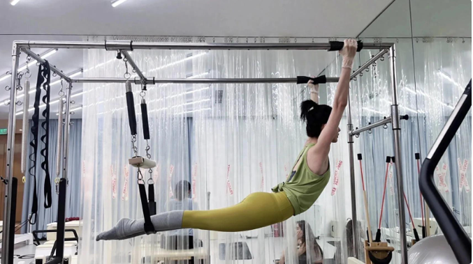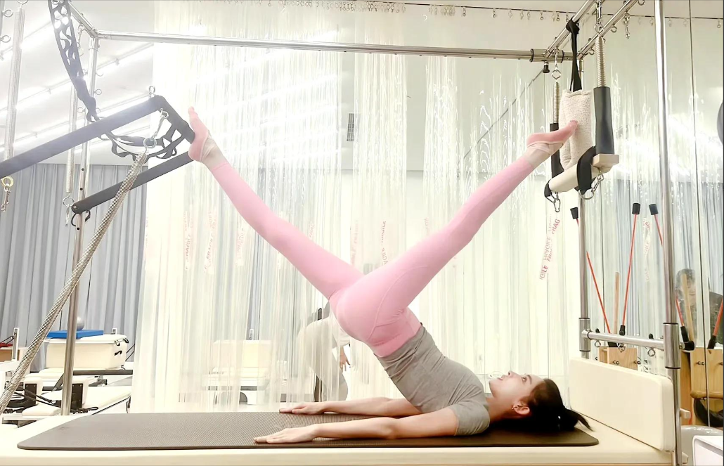 :在普拉提器械上,她双腿交叉悬空,仅凭腰腹力量支撑全身,身体绷成一条直线。哪怕表情因发力而拧紧,动作却精准如尺。这种“绷紧无一丝赘肉”的线条感,并非天生,而是日复一日对抗重力的结果。 - 紧身裤的“诚实检验”
