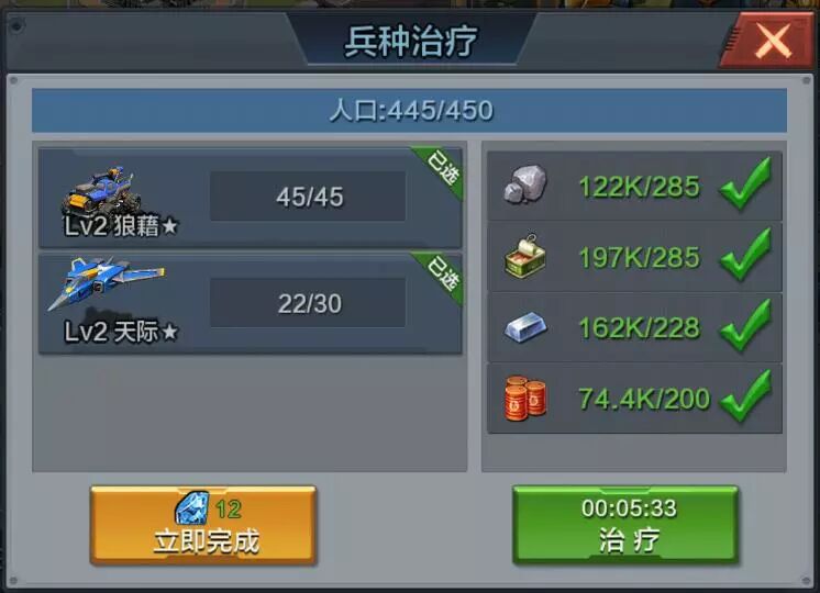 2、已进入伤兵营的兵种,玩家无法使用,必须要先治疗。