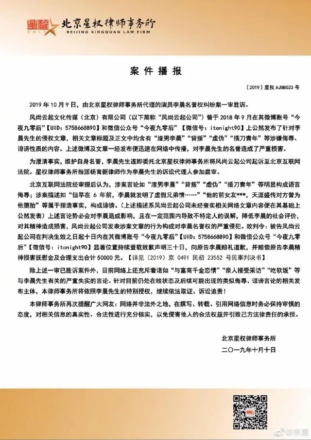 近日,李晨名誉权侵权案审判结果公布,