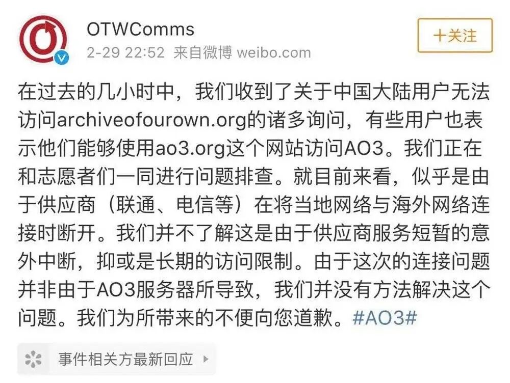 2月29日,中国大陆用户无法访问AO3,官方微博向用户发文致歉,“这次的连接问题并非由于AO3服务器所导致,我们并沒有方法解决这个问题”。