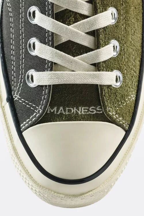 在该鞋款的设计上,低筒鞋身的内外侧搭配了麂皮和帆布两种不同面料的制作物,而鞋舌则保留上回的「MIL-SPEC」车章,鞋头前端亦绣有「MADNESS」字样。